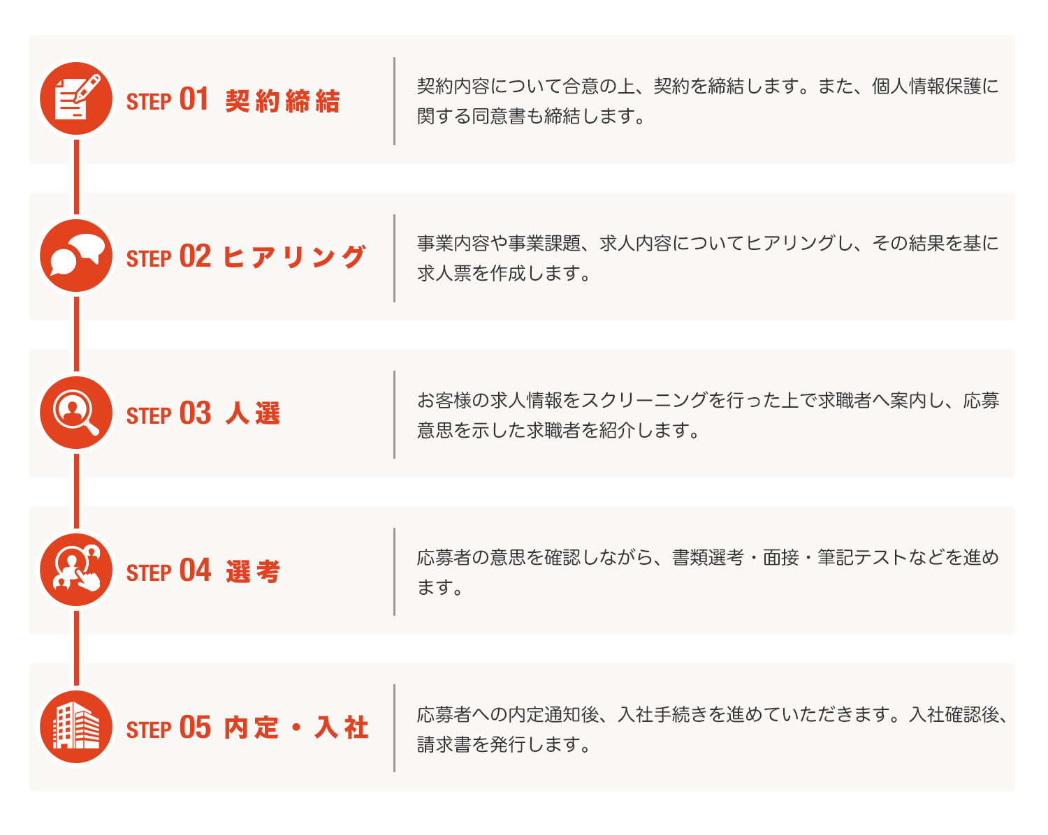 求人企業様のニーズに合う求職者を提携サービスでスカウトし、スクリーニングを行った上で紹介しています。完全成功報酬型のため、採用決定までは一切費用がかかりません。